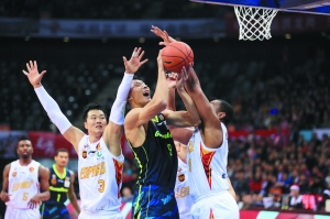 易建联篮下遭对手包夹。信息时报记者 陆明杰 摄