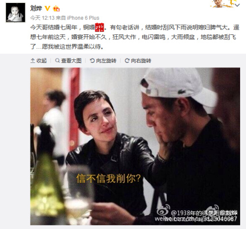 刘烨晒夫妻合影庆结婚七周