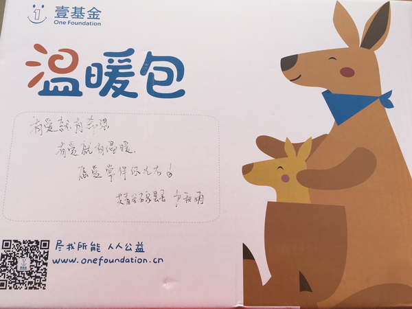 壹基金“温暖包”主要用于解决贫困地区儿童因御寒物资特别缺乏造成的过冬困难问题,同时为他们送去新年温暖及社会关爱。每个捐赠标准为365元,配置的应急生活物资以冬季保暖御寒物品、学习物资为主,包含棉衣、棉靴、袜子、帽子、围巾、手套、美术套装、袋鼠玩偶、书包、儿童减灾读本、绘图本、护手霜等13件物品,不只是满足山区孩子们过冬的需要,更是满足他们被爱的需要。